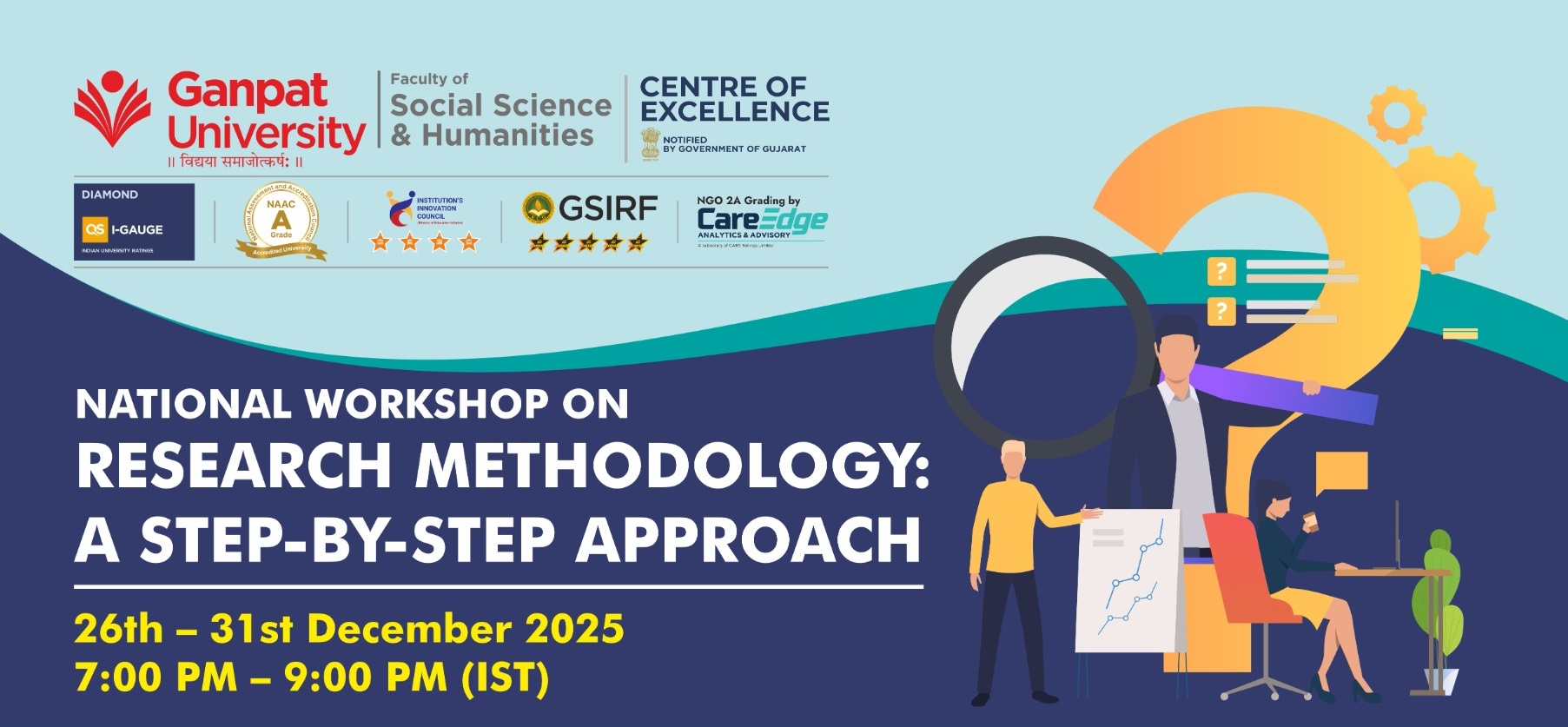 The Faculty of Social Sciences and Humanities, Ganpat University proudly presents a National Level Research Methodology Workshop designed to strengthen research skills among faculty members, Ph.D. scholars, and postgraduate students. The workshop offers a structured and practical understanding of the complete research process from problem identification to data analysis and proposal writing